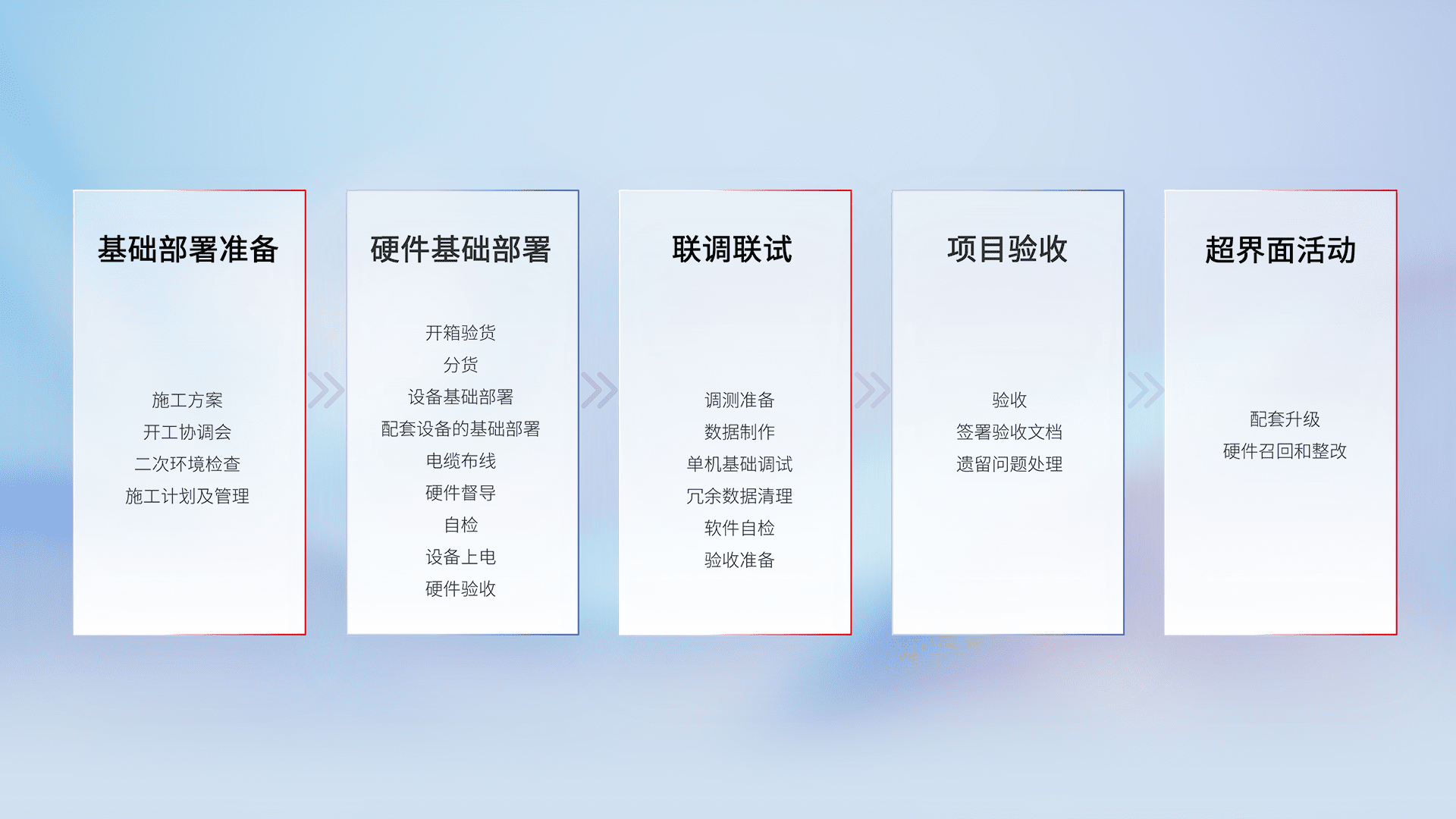 从基础部署准备、、、硬件基础部署、、联调联试、、、项目验收、、、越界面活动的全过程可追溯,,,保证施工质量和进度。。